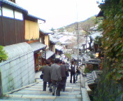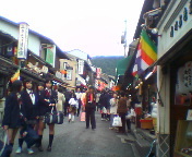 清水寺へ続く道には、修学旅行生の姿もちらほらと見かけます。みんなお茶屋さんへ入ったり、ソ\フトクリームをたべたり、おみやげを買ったり。