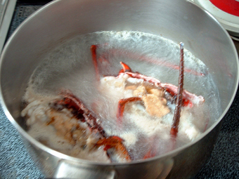 伊勢エビの頭は2つに割ってぐつぐつ煮ます・・・・ このままゆでて食べてもいいんだけど、今日は私の「おみそ汁」案が通り、伊勢エビのみそ汁をつくることに・・・・・ ううぅ~、私は、伊勢エビ「本体」より、この頭で作ったおみそ汁が大好きです^^