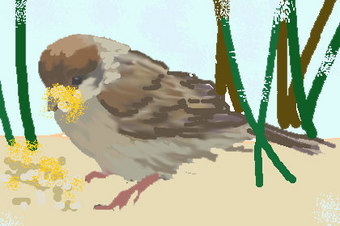 うちの母親がいつも庭先に、米のとぎ汁や、パンクズなどを出しておくと、すずめがやってくる。この近所に住むすずめたちだ。多い日は20羽くらい集団でやってくる。あまり広くない庭だが、すずめがエサをついばむにはさほど問題もなく、よくやってくる。この頃は、家で玄米を精米しているので、その米ぬかをまいてやると、胚芽や米の粉などをとても喜んで食べる。米ぬかをつつくと、のどが渇くらしいので、いっしょに水をやっておくと、顔中いっぱいに米ぬかをくっつけて無心についばむ。そして米ぬかでゴテゴテになった顔をふと持ち上げると、時折どこかでゴシゴシしてこすり取り、また食べ始める。かわいい・・・