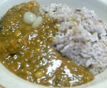 ぷぷちゃん特製の薬膳カレーです。御飯もアレコレ雑穀いっぱいの雑穀御飯(いつもより雑穀多め)。カレーは、玉葱、茗荷、生姜、パプリカ、人参、かぼちゃ、とらまめ、じゃがいも、ほうれん草、椎茸、しめじ、まいたけ、牛豚挽き肉…ほかにもいれたかな? 後は辣韮やら野菜類を添えて…