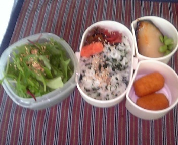 今日も元気の元、お弁当です♪ 今日のご飯は青じそと刻んだ梅干しと胡麻をまぶしてみました。右上のおかず入れは昨日に続き、鱈の西京焼(よく見えないけど)と、あさりのしぐれ、彩りにミツバを添えました。真ん中のおかず入れは、エビカツと、ソーセージと、冷凍の野菜揚げだんご。サラダは水菜と、ベビーリーフと、トマト、トッピングは、五穀ふりかけ。デザートはヨーグルトとブルーベリー。今日も、もずくのスープもつけました♪(^-^)b