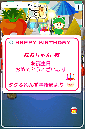 まぁ、タグの事務局よりのお誕生日プレゼント! 「ぷぷちゃん」は、「歳をとらない」ことになっているので、お誕生日はないことになっているんだけど・・・・ やっぱり、本当はお誕生日はあるものね^^ やっぱり、お祝い、嬉しいな!