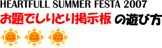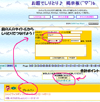 1.「題名」で「しりとり」をする掲示板だよ。一言メッセージも入れてね。