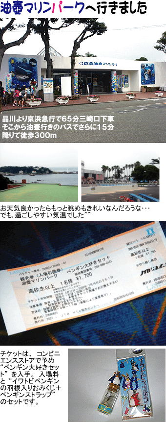 一番の目的は、2008年6月25日に行われる、堀川ひとみちゃんの「ひーたん生誕祭」へ出席する為の今回の東京行きですが・・・・・ それ以外の時間を使って 久々の「ペンギン行脚」・・・・・ 行ってまいりましたよ^^ 目的のペンギンスポットは、なんと4カ所!!!!! 2日間で4カ所・・・・・。相変わらずのハード行程だわww それも今回の目玉は、「油壺マリンパーク」!!!!!! 前回(2006年8月) 「鴨川シーワールド」へ行ったときも、関東在住時に行ききれなかった「鴨川」「油壺」のどっちにしようか・・・・・ と、迷い ・・・・・ やっぱ、規模でいったら「鴨シー」でしょってところで次回送りになっていましたが、とうとう行ってきました o(^ー^)o