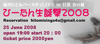 堀川ひとみちゃんのバースディライブが、2008年6月25日、東京目黒・音の箱で開かれるよ! 美味しいお料理と一緒に、たっぷり二時間!!!!!!!!! ひとみちゃんのライヴを満喫しよう^^