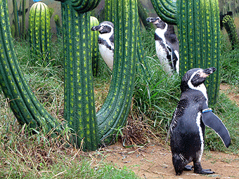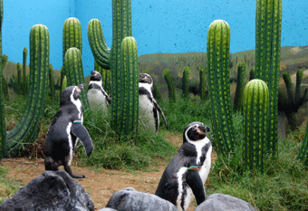 入るとまずすぐにペンちゃんがいました。この展示の仕方はこの水族館の結構「ウリ」なんだけど、やっぱり「ペンギン」というと「氷の上」を想像する人が多いので、こんな環境で生活しているペンギンもいるんだよってことを表現したくて、土の上にレプリカのサボテンと、草や岩を配置し、ペンギンの生きる世界を表現しています。この子達はチリやペルーの海域などに住むフンボルトペンギンですね。日本各地でもっともよく見かけるペンギンなのですが、自然界では絶滅危惧種です。