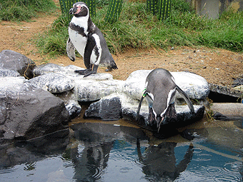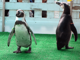 お散歩にでていたペンちゃんたちの水槽です。サボテンの島と隣り合わせに普通の水槽のような場所もあり。この水槽、柵の高さが高くって、私の身長で撮影すると柵のシマシマが入ってしまうので、まささんに撮ってもらいました(笑