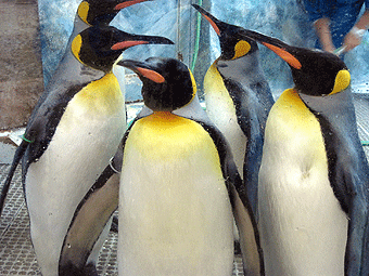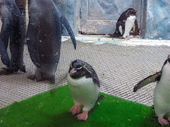 さて、さっきとは別の所にも他のペンちゃんがいます。もう少し寒い所に住んでいる「キングペンギン」と「イワトビペンギン」です。