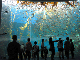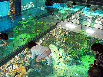 そして、ここは、この水族館の「新コーナー」で、なんと、巨大水槽の「上」に人が入れるようになっていて、さらにまわりがぐるっと鏡張りになっているので、まさに自分が水槽の中に入ってしまったかのように感じられ、「万華鏡」のようにも見えるオススメコーナーです。