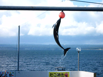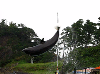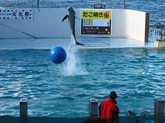 曇り空に白いボールなので見えにくいけど、上からつるされたボールを尾びれでキックしています。