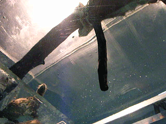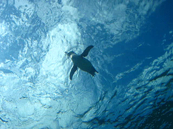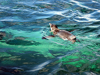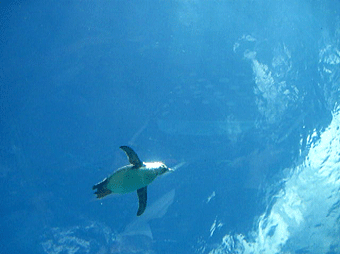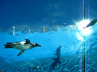 また、この水族館の目玉の一つとして、この「イルカたちの楽園」の下は通路になっていて、イルカやペンギンたちが泳いでいるところを「下」から眺められるんです。これまでにも八景島シーパラダイスにはイルカを泳ぐ姿を下からか眺められる施設があり、イルカ達が泳いでいる姿を「下(いわば海の中からに近い)」から見たことはありました。でも、ペンギンが泳いでいるのを「下」から見たのは今回が始めてでした・・・・・。その様子は、まさに「ペンギンが空を飛んでいる!」そのものでした。