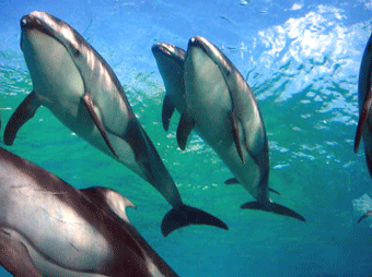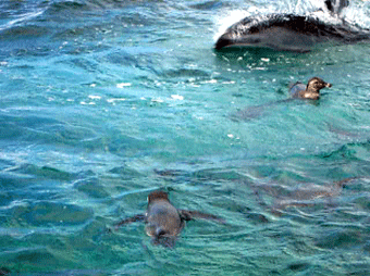 イルカとペンギンが一緒に泳いでいる・・・・。