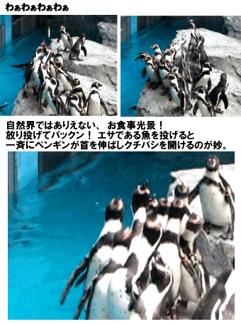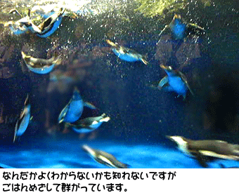 本編(サイト本体)の方でも後ほど掲載する予定ですが。豊橋の大所帯のぺんぎんです。最初は適度に泳いでる子もいれば、ボーっとしている子もいたのに、閉園間近の時間になったら、みんな一斉に泳いでいたんです。な、何コレ!? って感じです。30羽以上ものぺんぎんが、まるで洗濯機の中のような状態でわんさかと泳いでいました・・・・・。なぞです!
