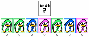 今度は『ブルーの2番』『ピンクの2番』『グリーンの1番』の中から取るカードを選びます。カードをどんどん取っていくと、右端からどんどん次のカードが出てくるので、そのカードを予測しながらカードを取っていきます。