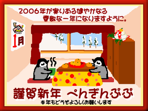 る人(実はペンギン)」が見える。お部屋の中には「かがみ餅」があって、おこたには「おミカン」がのっ